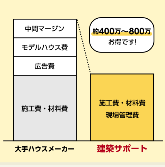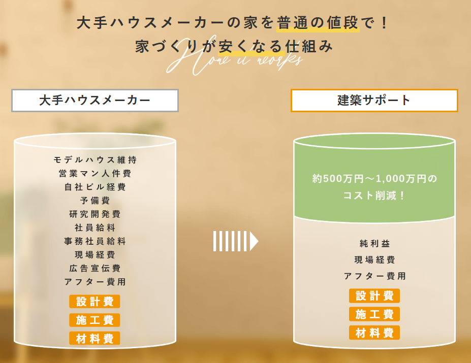 他の大手ハウスメーカーや有名工務店と同じ広さや仕様なら大体ですが半額又は500万円から1000万円くらいは安くなります。