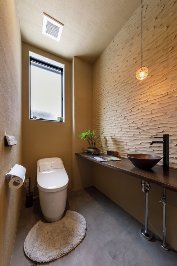 落ち着いたベージュのカラーで統一したトイレ。消臭・調湿効果に優れた薩摩中霧島壁がアクセントになっています。