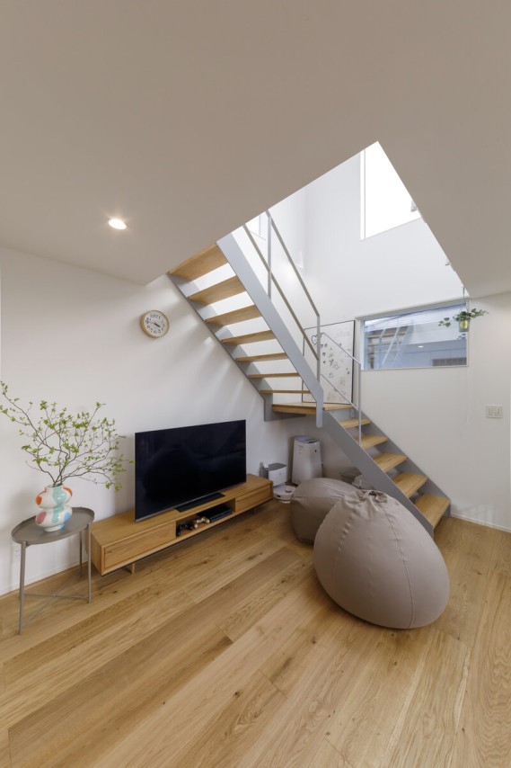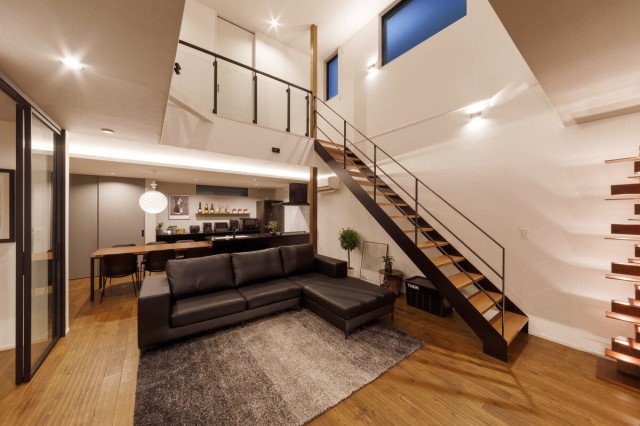 目線が上へと抜けていく吹抜けのリビング。スケルトンの階段をグレーにしたことで空間に統一感が生まれました。