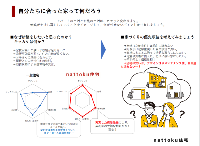 総予算、建物価格、スピード、材料選び、間取りなど、30~50項目で比較・検討し、あなたにとってベストな提案をいたします。